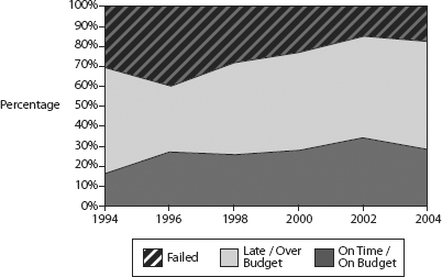 FIGURE 1-1: Software Project Outcomes, 1994–2004