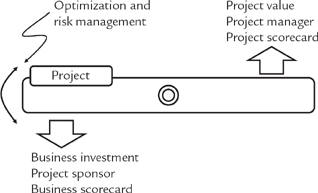 Let us begin our discussion about the value of projects with this idea: Project value is the worth of a project’s throughput, or the difference in business value measured before and after a project, as earned during the course of the project schedule. Business value is the worth of a project’s throughput applied to business needs, as measured over some business duration. Maximizing project value is really about optimizing and managing the tension between the project manager’s mission to manage for project value and the project sponsor’s charge to enhance business value. Managing the tension between business and project value is tantamount to optimizing project success in the context of business success. Such optimization—actually, the avoidance of suboptimization—is a trade-off of value propositions between and among projects and the business, and is a form of risk management aimed at both project and business objectives, as illustrated in Figure 1-1.