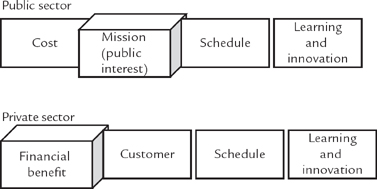 Another perspective is that shown in Table 1-4. Here we see a simple mapping by business sector according to objectives. Sector objectives express a mission, for example to provide for “satisfaction of public need.” The project manager, representing the project, also has a sector objective. For example, in the public sector, the project manager’s mission is to return best value outcomes to give the taxpayer the “most bang for the buck.”