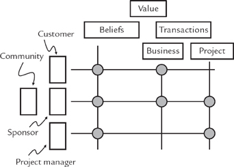 The community of project principals is influenced in its thinking and behavior by exposure to and experience with these value concepts. The entire community is guided by its value beliefs; however, acceptance and utilization of transactional values varies according to specific situations. A two-sided matrix diagram with intersecting points is a convenient way to illustrate who (on one side) is guided or influenced by what values (on the other side). One example of this who–what relationship is illustrated in Figure 1-3.