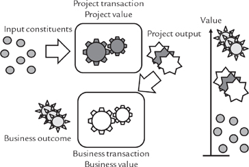 We can think of a project as a business process, albeit one that has a specific beginning and ending. In the doing, a project has the potential to add business value, because ideally project output is more valuable than its inputs—money, materials, and labor. In this sense, projects have a transformative effect for business value purposes: put something in, turn the crank—transformation occurs here—and output appears that is altogether different from any of the inputs.