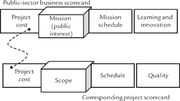 Project success, payoff, or value attainment is measured with several different metrics, some of which inform the project scorecard and others the business scorecard. Both scorecards reflect the biases and beliefs held by all the managers and organizations involved. For instance, in the public sector, mission—representing the public’s interests—usually dominates cost. In the private for-profit sector, financial benefit always dominates, or at least is first among equals. We see these ideas illustrated in Figure 1-2.