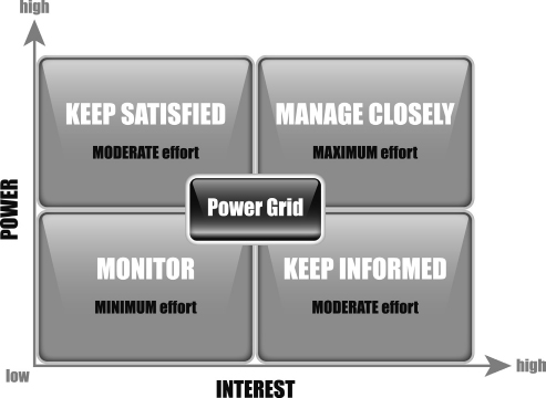 You can use the power grid shown in Figure 1-1 to assess your newly assigned sponsor—specifically her interest in your project (from high to low) and her actual power in your organization (also from high to low). This may well be challenging to determine early on—especially if you have never worked with this sponsor beforehand—however you can update your assessment as you personally get to know your sponsor better and you build a relationship.