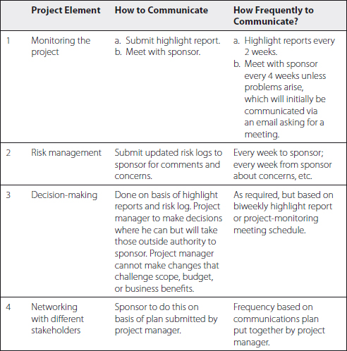 This is a good time to make sure the sponsor understands that there may be periods when she will need to spend more time than usual on the project. Let her know that you are conscious her time and that you will not be asking for her attention frivolously.