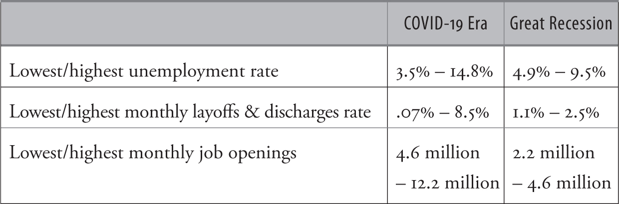 The three data points of the “COVID-19 Era” column show the whiplash impact of initial workforce desperation, which was later followed by unprecedented workforce security (“COVID-19 Era” refers to March 2020–May 2023). The data show how our unemployment rate plummeted from nearly 15 percent down to 3.5 percent, all while open jobs increased nearly threefold; the Great Recession period never resulted in such extremes.
