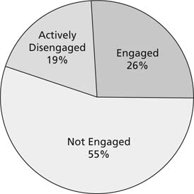 Current data suggests that most individuals working in organizations are not actively engaged (see Figure 1-2).1 The percentages in this figure were determined by an informal meta-analysis of three different studies on engagement by three different organizations.