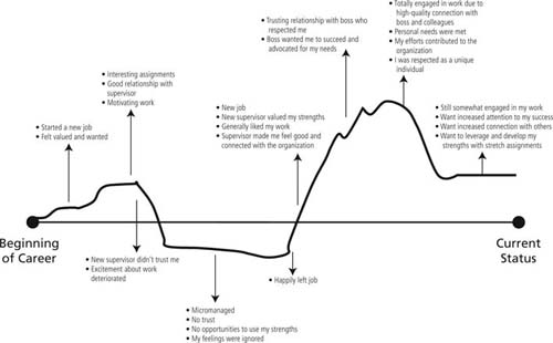 Look at the peaks on your career line. What made those moments high points in your career? What was it about the organization, and more specifically, about your leader, that helped you reach those points? How did your leader help you? What was the relationship like?